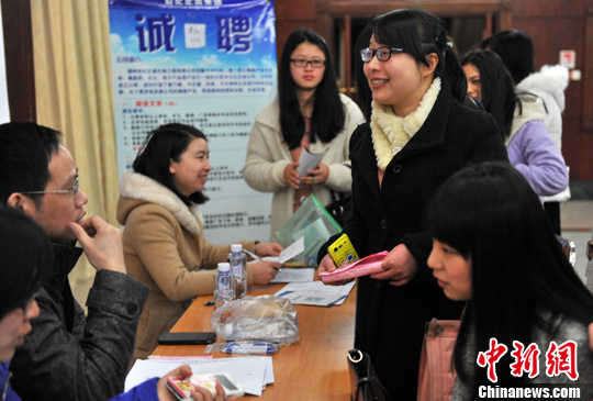 图为参加福建省福州市第六届女性创业就业专场招聘会的大中专毕业生在了解岗位信息。中新社发 吕明 摄