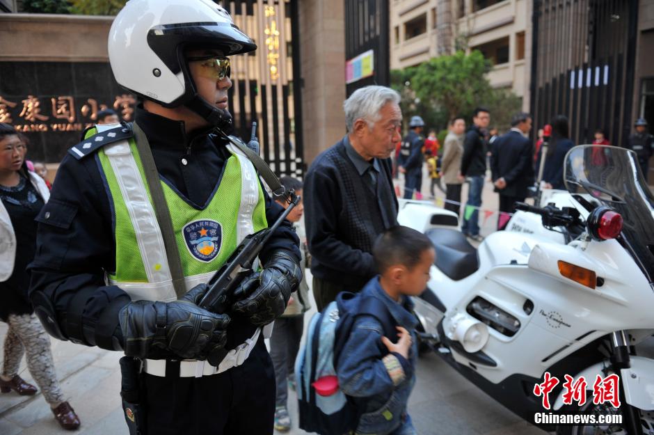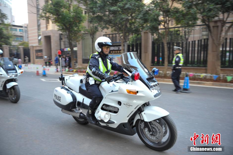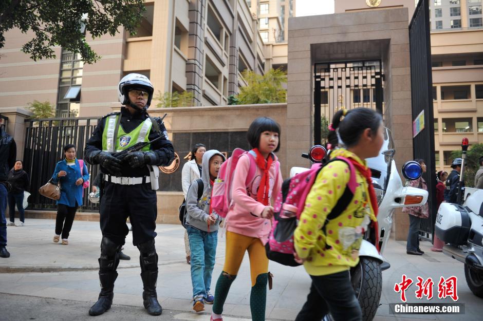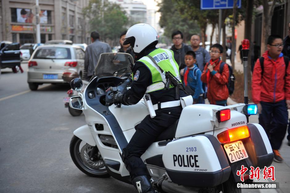 3月5日,交警在昆明校区周边道路进行武装巡逻,以保证学生的安全。中新社发 刘冉阳 摄