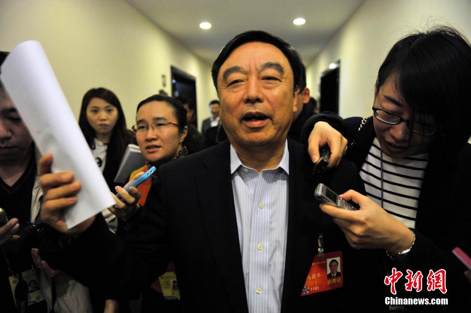 3月6日,全国政协十二届二次会议分组讨论政府工作报告。经济界小组讨论结束后,马蔚华委员被众多媒体追访。中新社发 骆云飞 摄