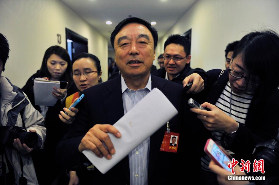 3月6日,全国政协十二届二次会议分组讨论政府工作报告。经济界小组讨论结束后,马蔚华委员被众多媒体追访。中新社发 骆云飞 摄