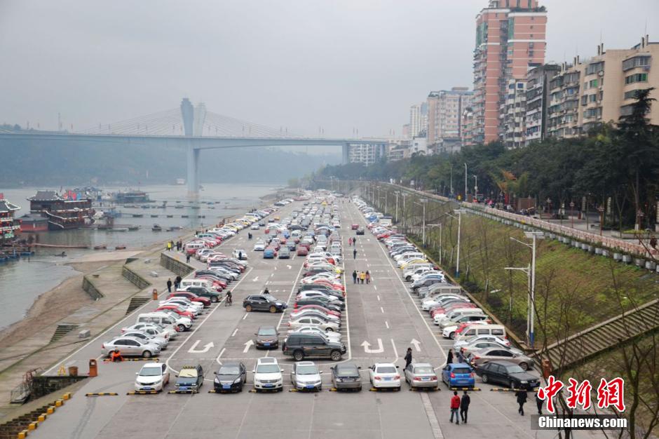 四川泸州紧邻长江,2001年曾因滨江路综合整治工程获中国人居环境奖。2012年,作为重点民生工程,该市再次大手笔改造整治两江四岸,霸气停车场应运而生。超过3万平米的面积,千个车位一字排开,临江停车场气势犹如飞机跑道。尤其是近日正式对外开放后,这里更是成了一道新的风景线,前来围观留影者络绎不绝。一些车主戏称,停好车要走十多分钟才能出去,有时候还找不着车了。中新社发 周亚强 摄