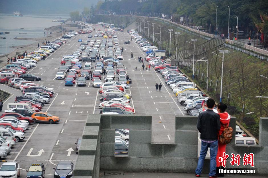 四川泸州紧邻长江,2001年曾因滨江路综合整治工程获中国人居环境奖。2012年,作为重点民生工程,该市再次大手笔改造整治两江四岸,霸气停车场应运而生。超过3万平米的面积,千个车位一字排开,临江停车场气势犹如飞机跑道。尤其是近日正式对外开放后,这里更是成了一道新的风景线,前来围观留影者络绎不绝。一些车主戏称,停好车要走十多分钟才能出去,有时候还找不着车了。中新社发 周亚强 摄