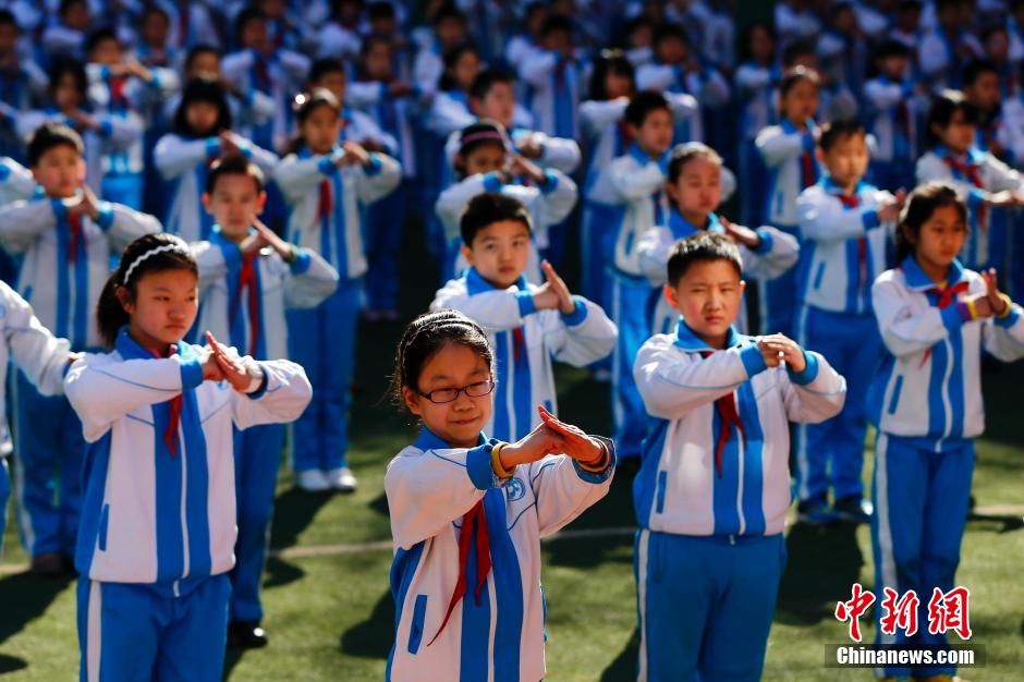 3月6日,北京交大附小的同学们在课间操时间练习养生气功八段锦。当日,该校召开了“智慧养育生命”开题及专题研讨会。课题研究方向为在中国传统文化、特别是中医文化指导下,用符合自然规律的生活方式来实现学生的可持续发展。学校不仅将八段锦列入课间操,还要求孩子科学均衡饮食、注重睡眠数量质量、合理分配学习娱乐时间等。让孩子从小学会科学地管理好自己的身体、饮食、情绪,将使儿童终身受益。中新社发 富田 摄