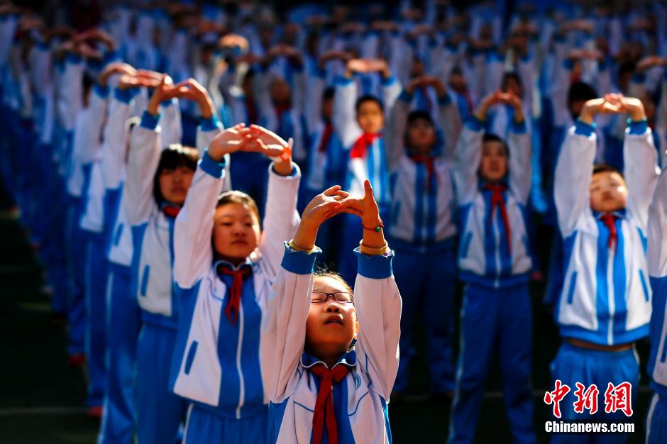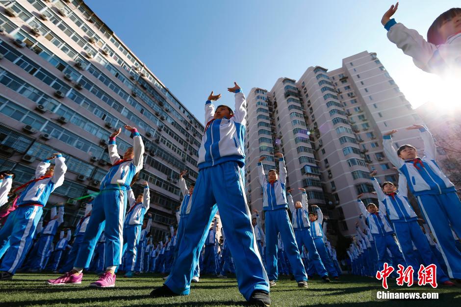 3月6日,北京交大附小的同学们在课间操时间练习养生气功八段锦。中新社发 富田 摄
