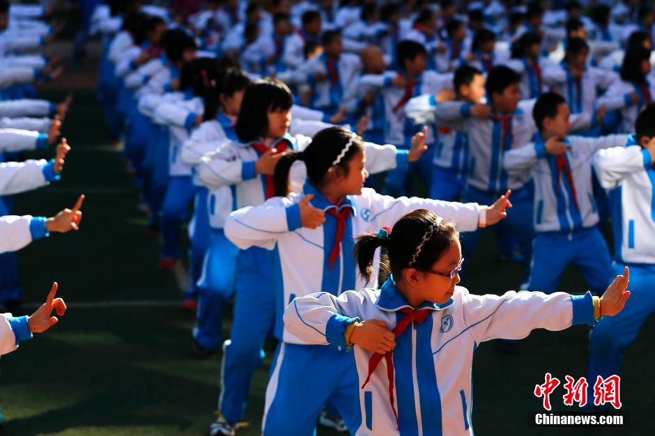 3月6日,北京交大附小的同学们在课间操时间练习养生气功八段锦。中新社发 富田 摄