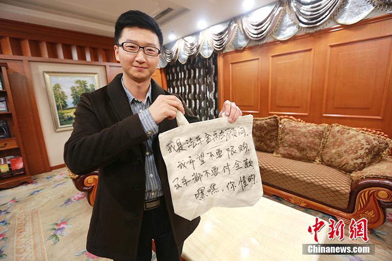3月6日,成都金融圈一些美女和帅哥们用自制的环保袋晒各自的心愿,环保袋上使用了时下流行的“嘿嘿”“你懂的”等热词组成的心愿,被网友称之为嘿嘿体。钟欣 摄