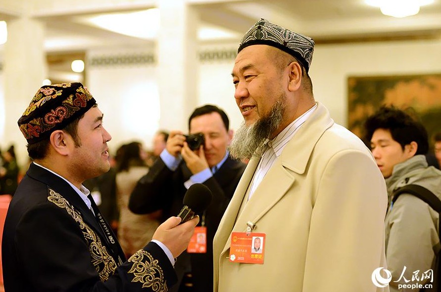 3月5日,第十二届全国人民代表大会第二次会议在北京人民大会堂开幕。图为代表接受记者采访。蔡军 摄