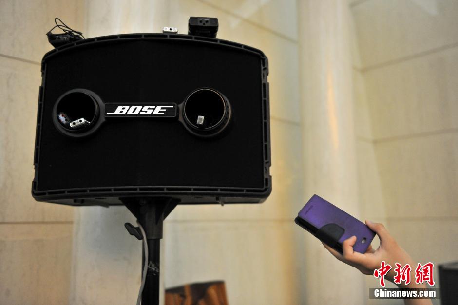 3月6日,十二届全国人大二次会议各代表团审议政府工作报告。在一个塞有各种录音器材的音箱边,一名文字记者将录音设备靠近音源,录下会议“好声音”。中新社发 金硕 摄