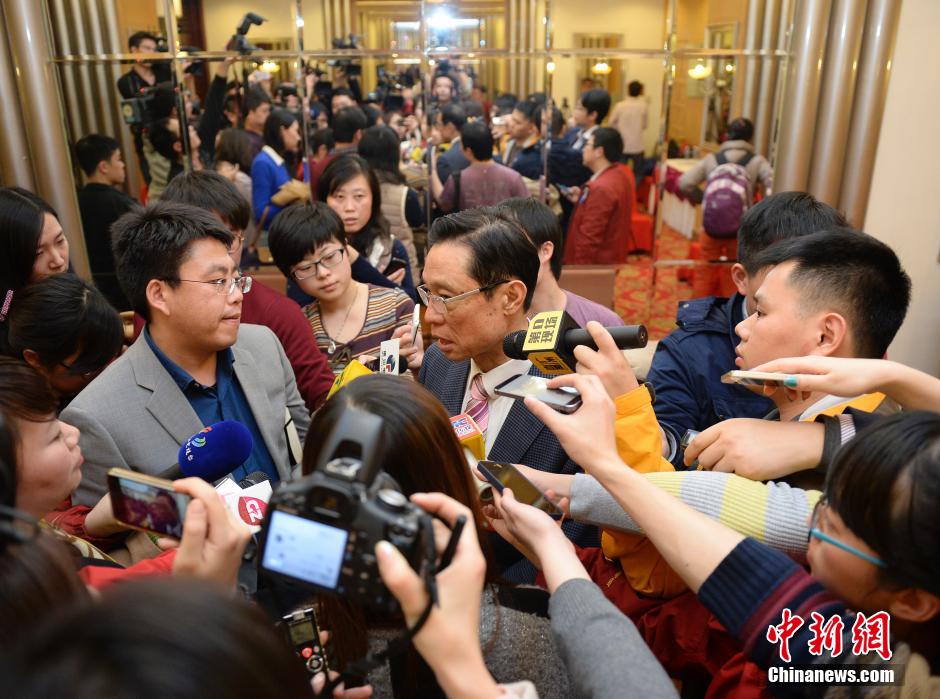 3月6日,全国人大代表、中国工程院院士钟南山在北京答记者问。会后,记者仍将钟南山团团围住提问。中新社发 侯宇 摄