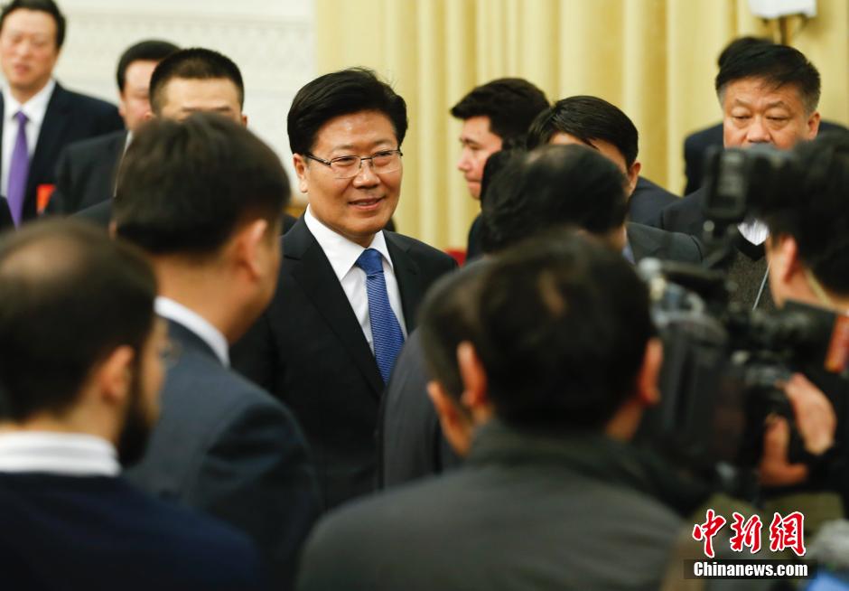 3月6日,十二届全国人大二次会议新疆代表团审议政府工作报告。会议结束后,新疆自治区党委书记张春贤被媒体围堵追问。中新社发 杜洋 摄