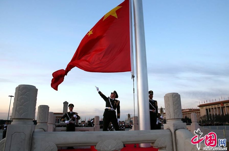 3月5日清晨,武警国旗护卫队举行升旗仪式。李光印 摄