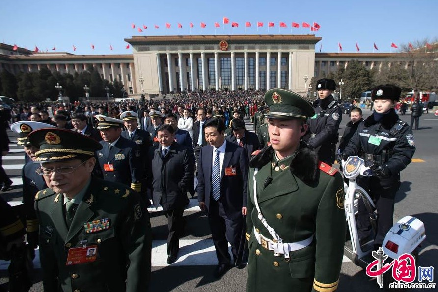 3月5日,武警北京总队天安门支队战士在广场执勤。 李光印 摄