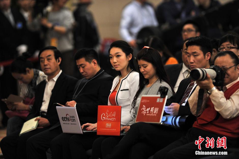 3月8日“国际妇女节”,女记者们不离岗位,在中国外交部长记者会现场采访。中新网记者 金硕 摄