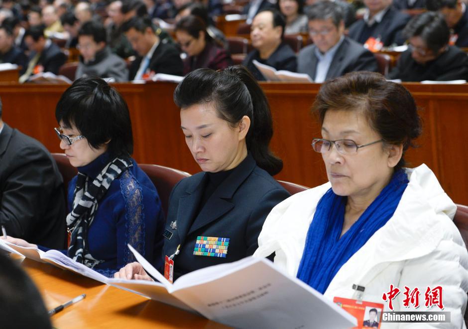 3月8日上午,全国政协十二届二次会议第三次全体会议在北京人民大会堂举行。宋祖英、宋春丽委员认真听取委员大会发言。中新社发 刘震 摄