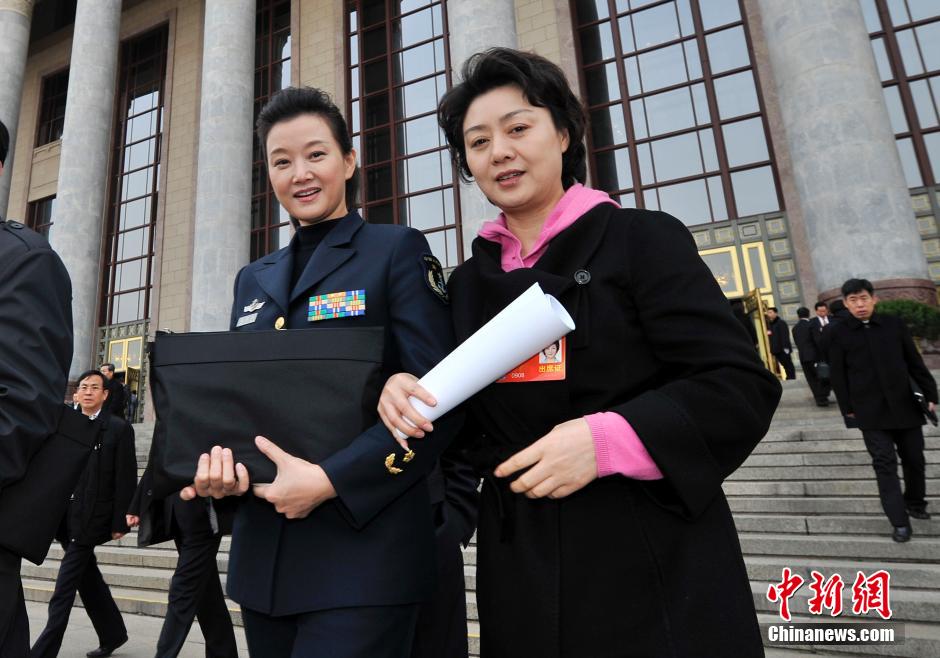 3月7日,全国政协十二届二次会议在北京人民大会堂举行第二次全体会议。全国政协委员宋祖英与李胜素会后走出会场。中新社发 骆云飞 摄