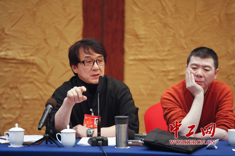 3月11日,全国政协十二届二次会议小组讨论会继续进行,在文艺界别小组讨论会上,政协委员们发言踊跃,讨论气氛热烈。图为政协委员成龙谈社会主义核心价值观问题,并且讲述了自己的救人经历。中工网记者韩靖摄