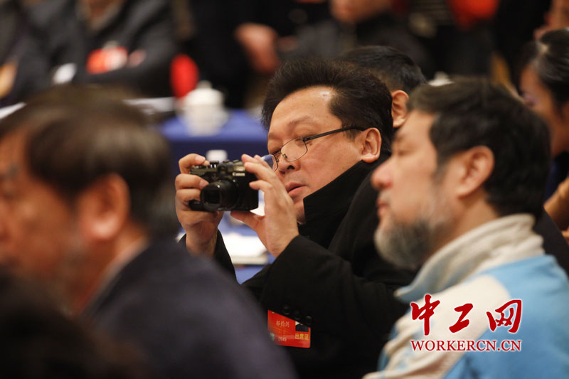3月11日,全国政协十二届二次会议小组讨论会继续进行,在文艺界别小组讨论会上,政协委员们发言踊跃,讨论气氛热烈。图为政协委员郁钧剑边听会边用相机记录。中工网记者韩靖摄