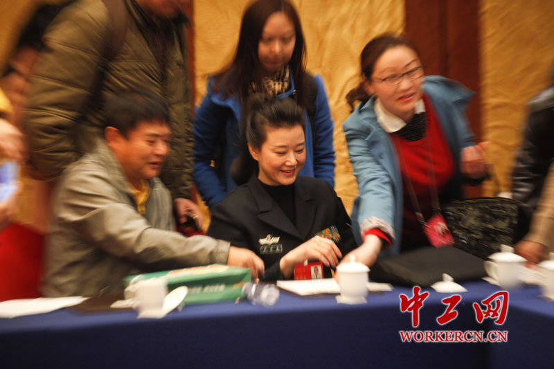 3月11日,全国政协十二届二次会议小组讨论会继续进行,在文艺界别小组讨论会上,政协委员们发言踊跃,讨论气氛热烈。图为政协委员宋祖英会后忙签名。中工网记者韩靖摄