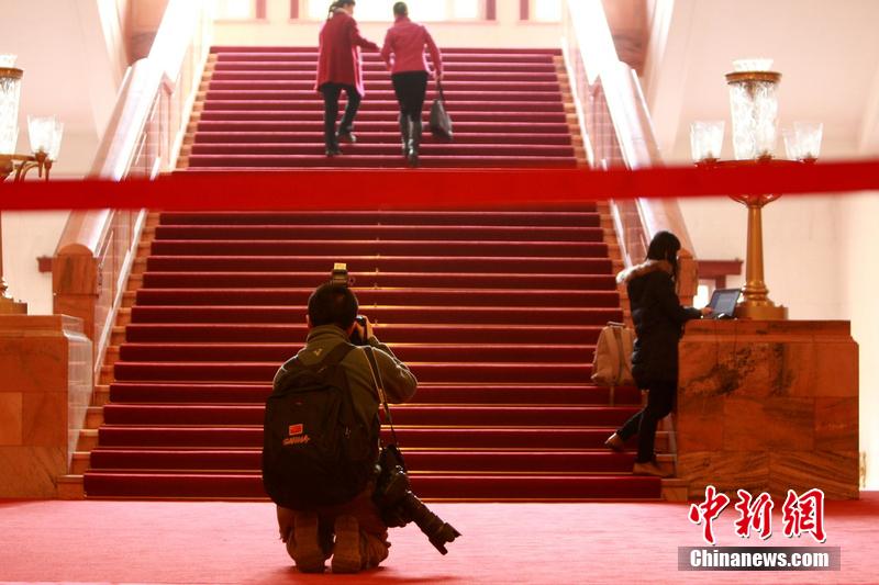 3月10日,参与采访两会的摄影记者跪在地上选取角度。图片来源:东方IC