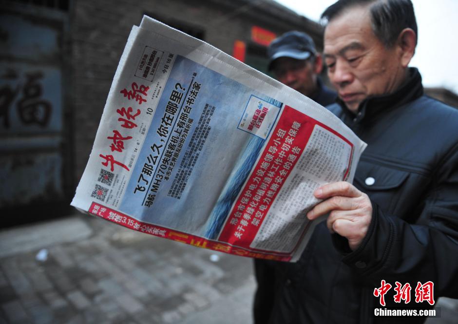 3月10日下午,邢台市民正在看当地的报刊《牛城晚报》,报纸头版头条“飞了那么久,你在哪里?”,马航失联客机上的一位邢台青年书法家张中海引发全城牵挂。据了解,马来西亚航空公司飞往北京的MH370航班上有18名河北籍乘客。中新社发 翟羽佳 摄