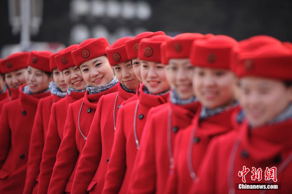 3月10日,第十二届全国人民代表大会第二次会议在人民大会堂举行第三次全体会议,听取最高人民法院院长周强作最高人民法院工作报告;听取最高人民检察院检察长曹建明作最高人民检察院工作报告。大会礼仪小姐在人民大会堂外合影留念。中新社发 陈超 摄