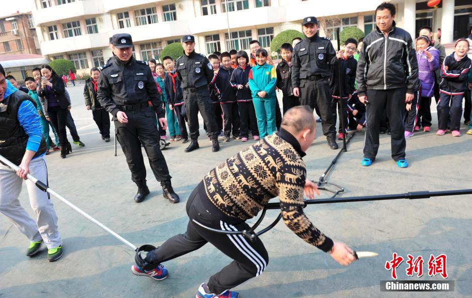 3月10日,特警演练“一招制敌术”。当日,济南特警支队队员走进山东师范大学附属小学,教授学校安保人员和老师“一招制敌术”,以延缓闹事者施暴进程,保护学生安全快速离开现场。中新社发 张勇 摄
