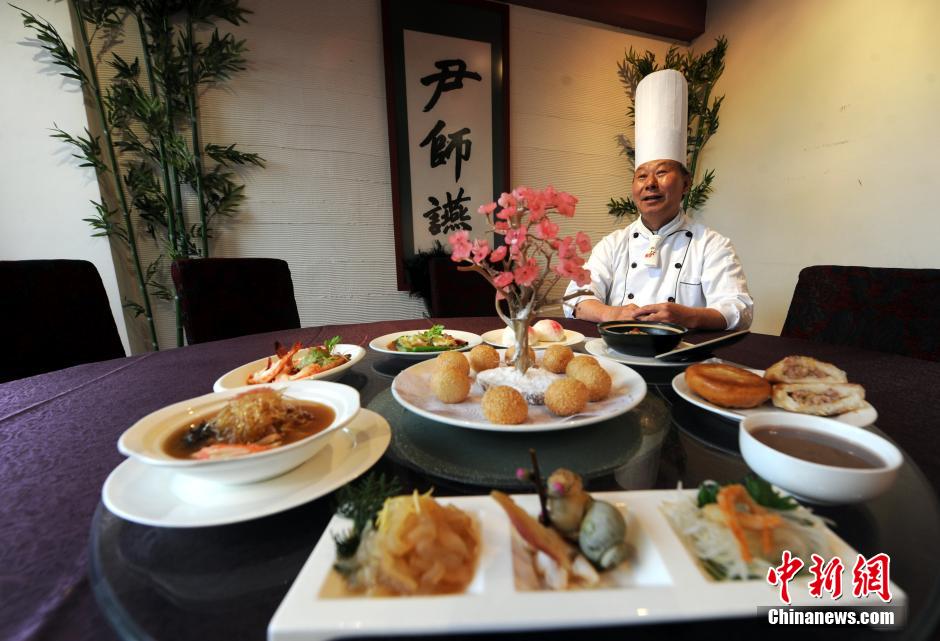 图为尹达刚师傅讲述其创作的“康熙宴”故事。中新社发 张宇 摄