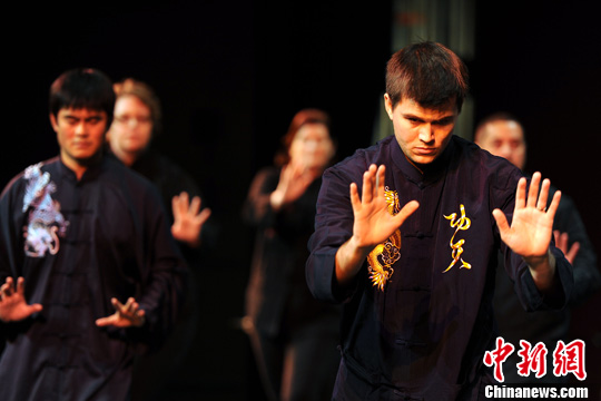 当地时间3月10日,美国加州长滩州立大学举行2014年中国文化周活动。在当天举行的开幕式上,洋学员在二胡曲的伴奏中打太极拳。中新社发 毛建军 摄