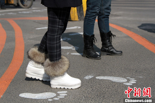 沈阳市南五马路交通岗处,专门为行人设置了等候区,并印有卡通形象的小脚丫。中新社发 于海洋 摄