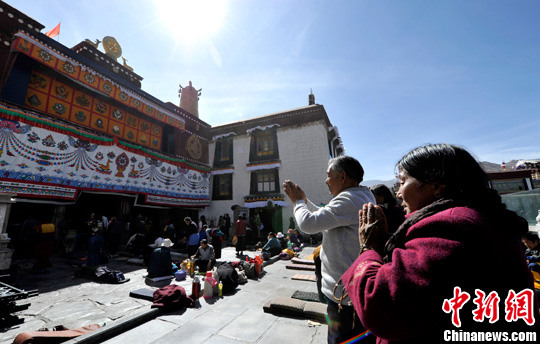 3月10日,天气回暖,拉萨民众在大昭寺前朝拜。中新社发 李林 摄