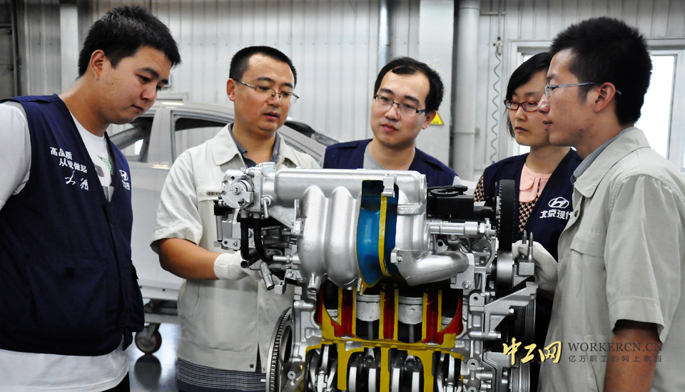 中工网走进北汽集团北京现代汽车装配车间采访一线劳模代表王志伟,用镜头记录王志伟一天的工作。图为王志伟与创新团队讨论现代车型发动机在装备是需要注意事项。    中工网记者  毛邓摄