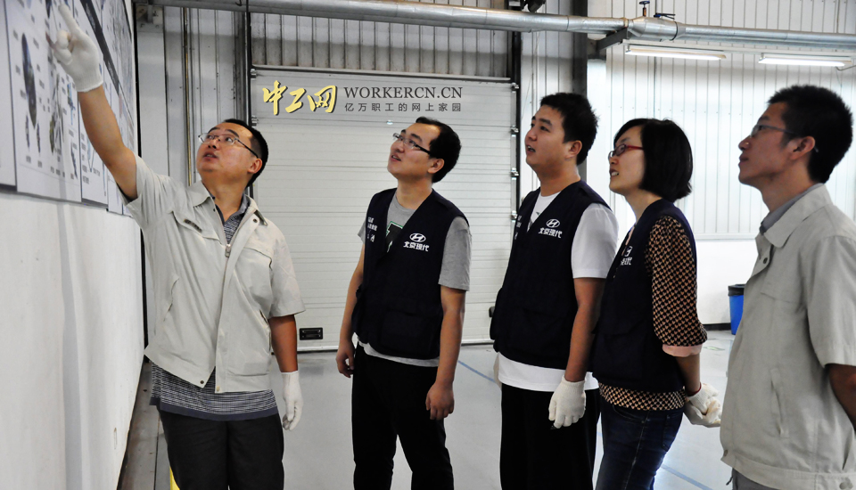 中工网走进北汽集团北京现代汽车装配车间采访一线劳模代表王志伟,用镜头记录王志伟一天的工作。图为王志伟现场授课,给来参观的工会干事讲解整个总装配车间流水线作业。 中工网记者 毛邓摄