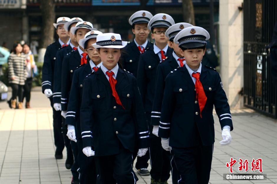 图为“小交警”整齐列队走上街头“执勤”。 王思哲 摄