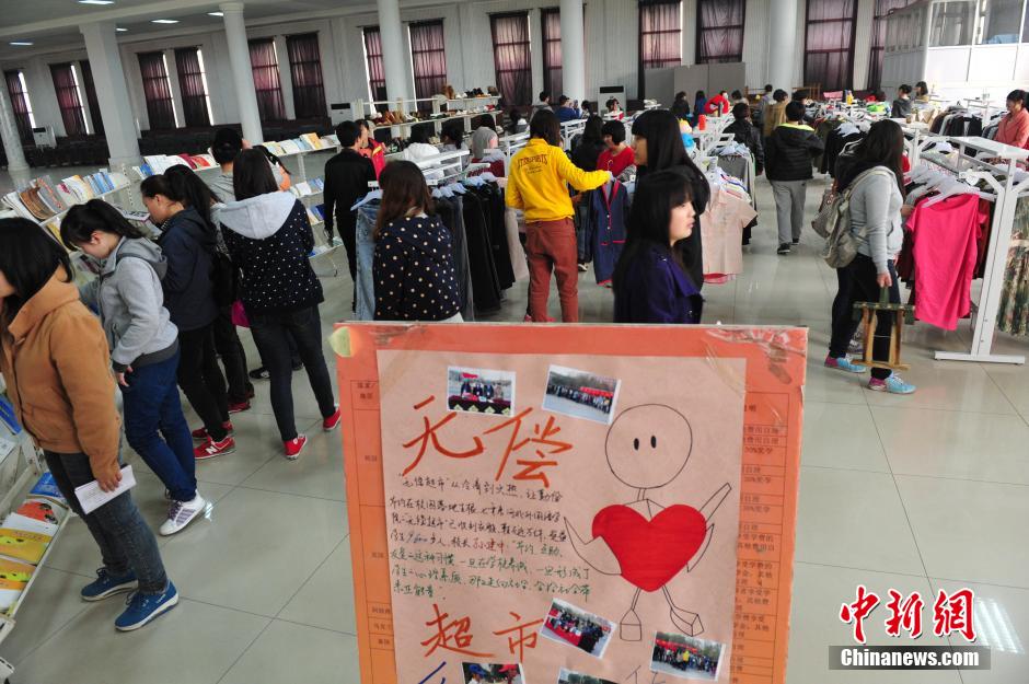 3月11日下午,河北外国语学院学生自创的“无偿超市”内,学生们正在“购物”。据了解,最初是让师生把自己暂时用不到的东西拿出来无偿奉献给有需要的人,后来捐赠物品越来越多,便正式命名为“无偿超市”。该超市连续8年,已累计收到各类捐赠物品2万余件,受益学生近万人。中新社发 翟羽佳 摄