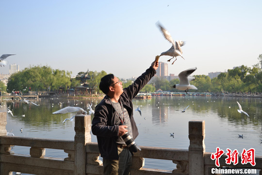 3月13日,昆明翠湖公园近半数红嘴鸥已离开,依依不舍的市民前来为即将离开的海鸥赠送“口粮”。中新社发 蒋卓成 摄
