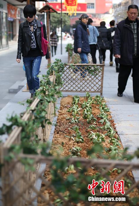 3月13日,两块总占地十多平米的菜地出现在南京街头举办的旅游展上,虽然面积不大,但种的是实实在在的青菜,加上篱笆围着,营造出一股田园风情,引来市民围观。中新社发 泱波 摄