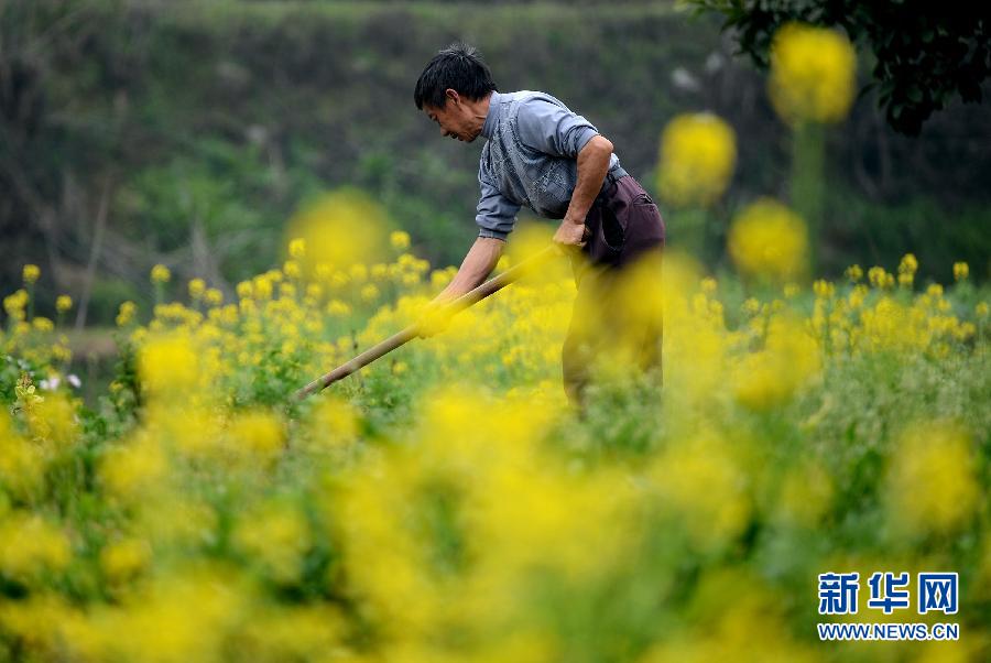 3月12日,湖北省宣恩县宝塔村一名农民在田间耕作。阳春三月,万物复苏,农民在春意盎然的田间耕作,“绘就”一幅美丽的春耕图。 新华社发(宋文 摄)