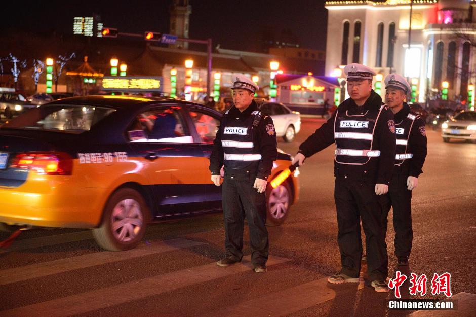 3月12日晚,内蒙古呼市公安局交通警察支队的交警在十字路口对来往车辆进行检查。当日,内蒙古自治区多地交警集中开展行动,对车辆进行检查,共出动警力1万5千余人、警车4千余量、执勤点约1千4百个,查处无证驾驶、酒后驾驶等各类违法行为。中新社发 刘文华 摄