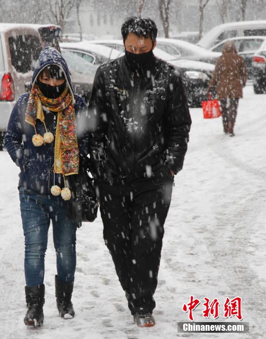 3月17日,哈尔滨降下大雪,市民包裹严实出行。中新社发 胡迪 摄