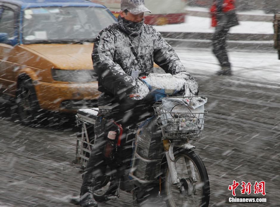 3月17日,哈尔滨降下大雪,一名骑车的市民雪中出行。中新社发 胡迪 摄