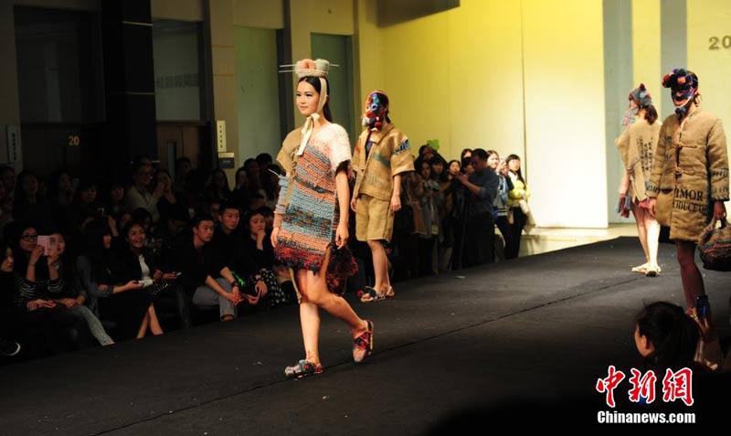 3月18日,主题为“点触”的武汉纺织大学服装学院2014毕业作品展在武汉纺织大学表演厅开幕,以创新实用与夸张创意的毕业作品展为现场观众带来一场视觉的盛宴。在11天的时间里,来自服装设计、服装贸易、形象设计、服装表演、广告表演、服装制版6个专业15个班级的430名毕业生以专场发布的方式展示其毕业时装作品。中新社发 张畅 摄