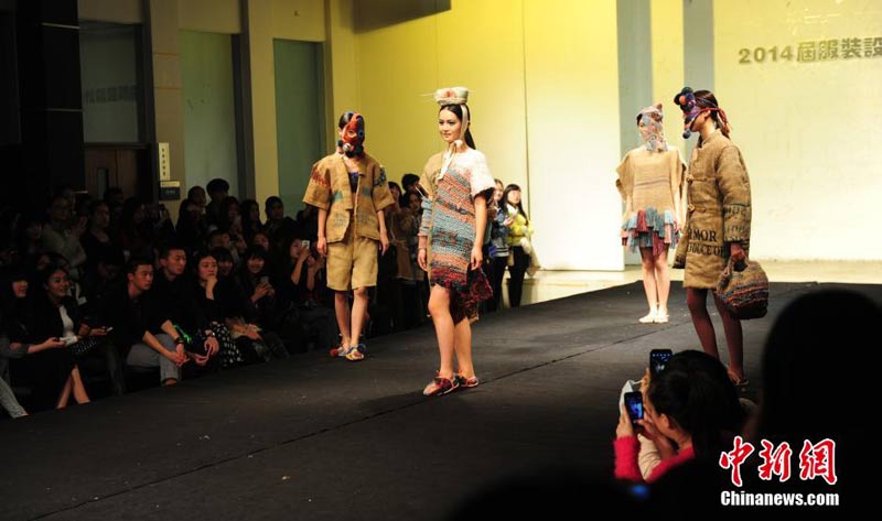3月18日,主题为“点触”的武汉纺织大学服装学院2014毕业作品展在武汉纺织大学表演厅开幕,以创新实用与夸张创意的毕业作品展为现场观众带来一场视觉的盛宴。在11天的时间里,来自服装设计、服装贸易、形象设计、服装表演、广告表演、服装制版6个专业15个班级的430名毕业生以专场发布的方式展示其毕业时装作品。中新社发 张畅 摄