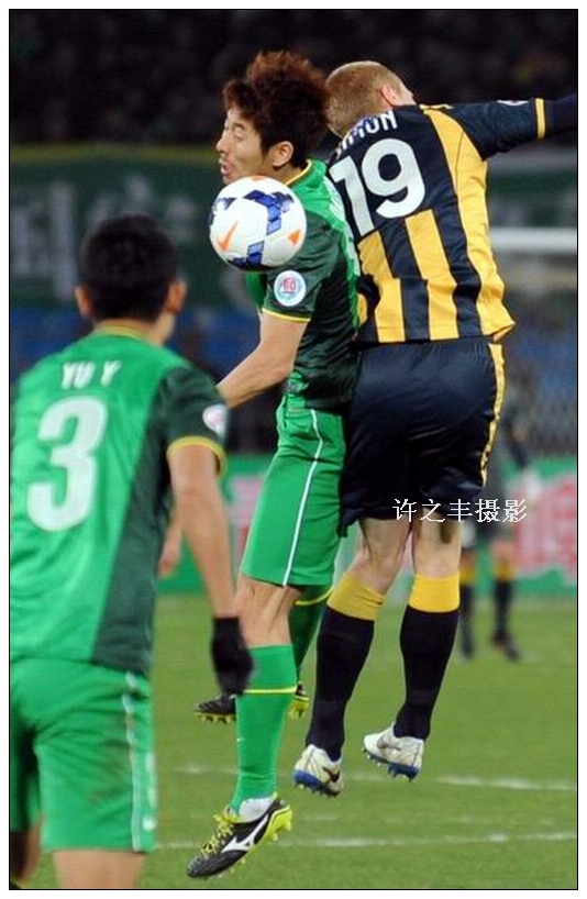 2014年3月19日晚,北京国安主场工人体育场迎来亚冠联赛小组第3轮同中央海岸水手的较量,国安最终北京国安2比1战胜对手。小组3战之后国安1胜2平积5分,跃居小组头名。图为国安队邵佳一打入的第一球。