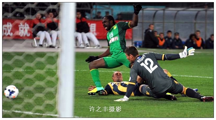 2014年3月19日晚,北京国安主场工人体育场迎来亚冠联赛小组第3轮同中央海岸水手的较量,国安最终北京国安2比1战胜对手。小组3战之后国安1胜2平积5分,跃居小组头名。图为国安队邵佳一打入的第一球。