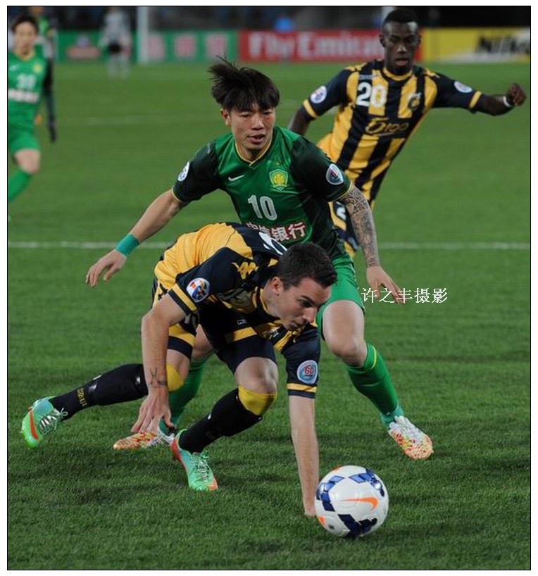 2014年3月19日晚,北京国安主场工人体育场迎来亚冠联赛小组第3轮同中央海岸水手的较量,国安最终北京国安2比1战胜对手。小组3战之后国安1胜2平积5分,跃居小组头名。图为国安队邵佳一打入的第一球。