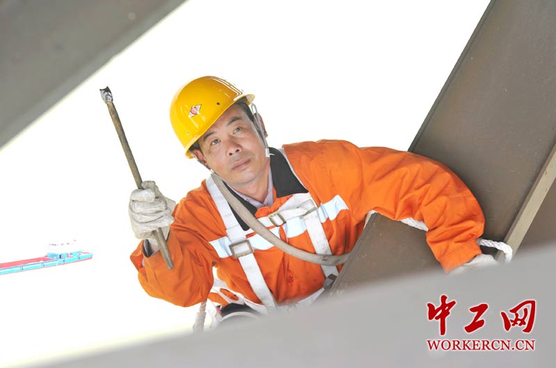 夏天高温酷热,冬天江风凛冽是大桥上的特点。孙凤生日复一日的攀爬钢梁、下穿桥墩,检查是否存在支座位移、钢轨爬行,以及螺栓、纵横梁、温调器等是否出现了伸缩或存在裂纹。对于常人来说,站在30多米高空,望着脚下江面上帆船如一页扁舟心都发怵,何况他还要上攀下爬进行各种检测作业。在上平联横梁检查时,要系上安全带一根杆一根杆爬,一米不漏的检测,由于横梁处于公路面之下,下雨时有大量泥浆通过伸缩缝流到横梁上,每次不是一身泥就是一身土。