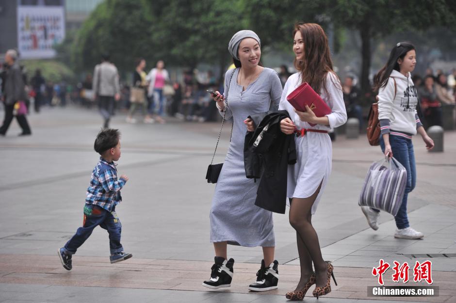 3月19日,重庆气温飙升近30摄氏度,不少市民换上了清凉艳丽的夏装。图为市民穿清凉夏装出街。中新社发 陈超 摄