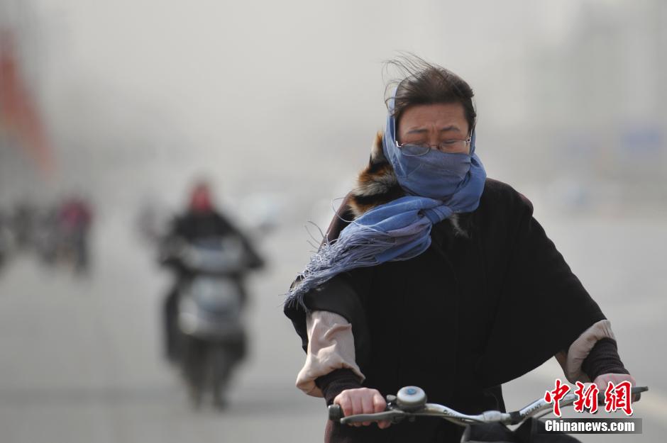 3月19日下午,短时七级大风突袭山西太原,出行民众“全副武装”。短时大风伴随着扬沙致使当地沙尘漫天,空气污染严重。中新社发 韦亮 摄