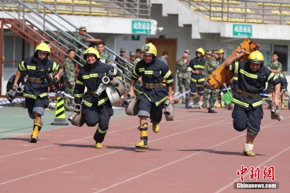 图为四名消防队员正在进行100米物资疏散救助操比赛。王川源 摄