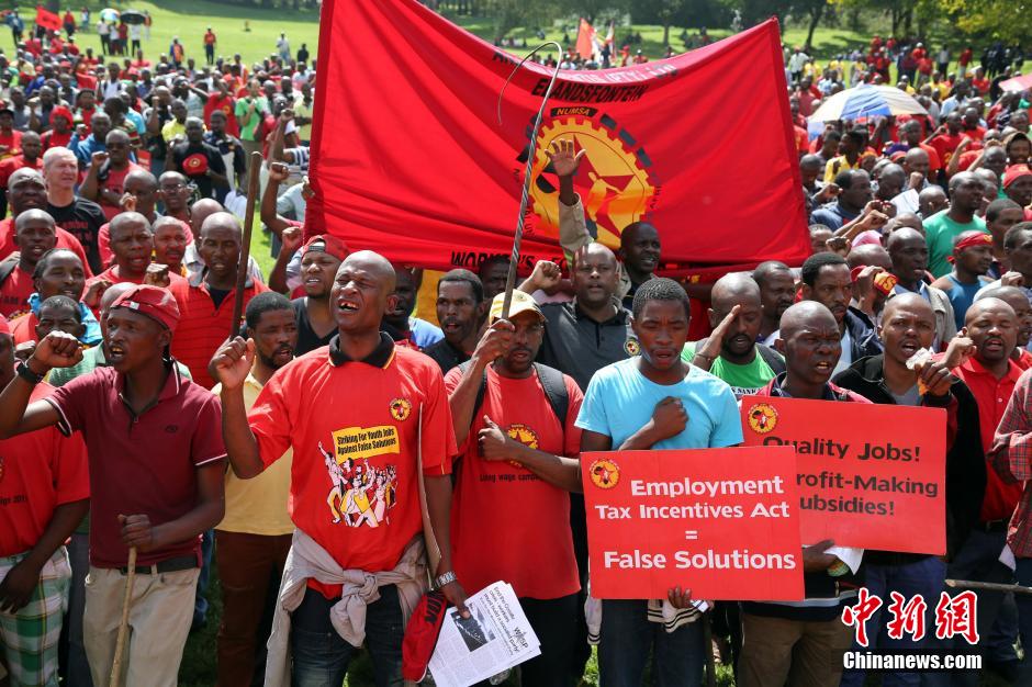 当地时间3月19日,南非金属制造工会发起全国联合大罢工,动员50万金属制造行业的工人与其他工会的工人,以及妇女、学生走上街头,抗议南非促进就业的新法案以及居高不下的失业率,并喊出“粉碎不公正的资本主义体系!”等口号。图为罢工现场。中新社发 宋方灿 摄